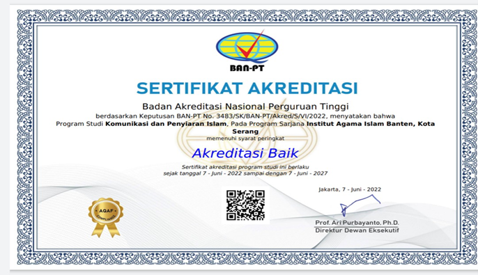 Akreditasi Program Studi (APS) Komunikasi dan Penyiaran Islam (KPI) Fakultas Dakwah, berdasarkan Keputusan Badan Akreditasi Nasional Perguruan Tinggi Nomor: 3483/SK/BAN-PT/Akred/S/VI/2022 Tanggal 7 Juni 2022 Tentang Peringkat Akreditasi Program Studi Komunikasi dan Penyiaran Islam pada Program Sarjana Institut Agama Islam Banten, Kota Serang dengan peringkat akreditasi “BAIK”, masa berlaku 5 (lima) tahun, terhitung mulai tanggal 7 Juni 2022 sampai dengan tanggal 7 Juni 2027;